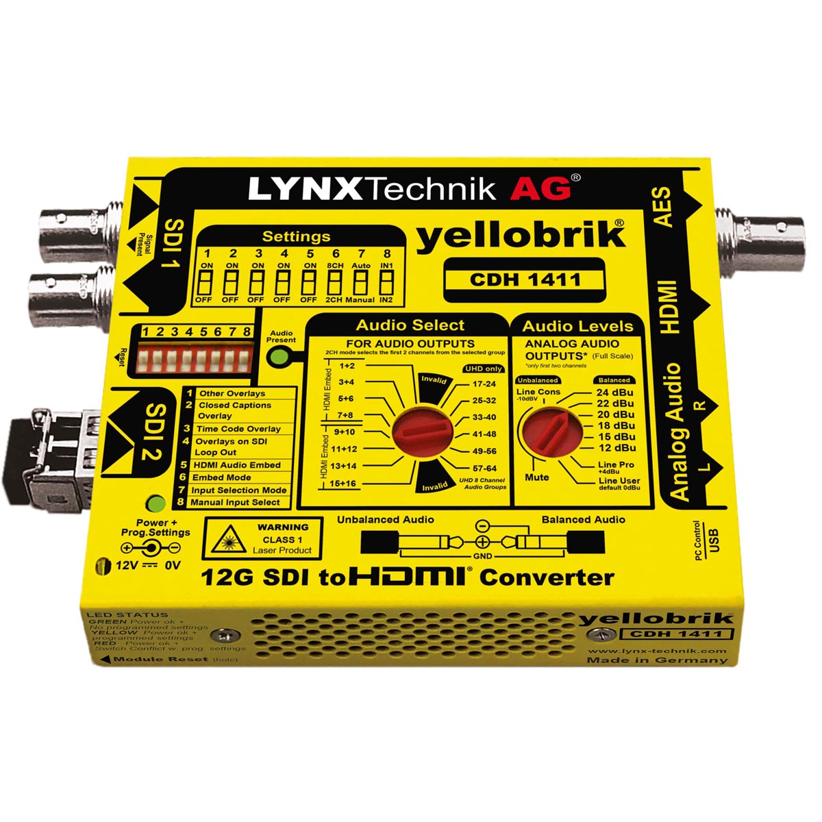 The CDH 1411 is a versatile, compact 12G-SDI to HDMI converter designed to aid monitoring and displaying uncompressed video signals in broadcast, post production and pro AV markets. Easily convert any compatible 12G-SDI video signal into the equivalent HDMI signal. Monitor Closed Captions, audio levels of embedded channels, and much more. Fiber connectivity options add SDI fiber transmission and/or SDI fiber reception using the integrated fiber SFP socket.