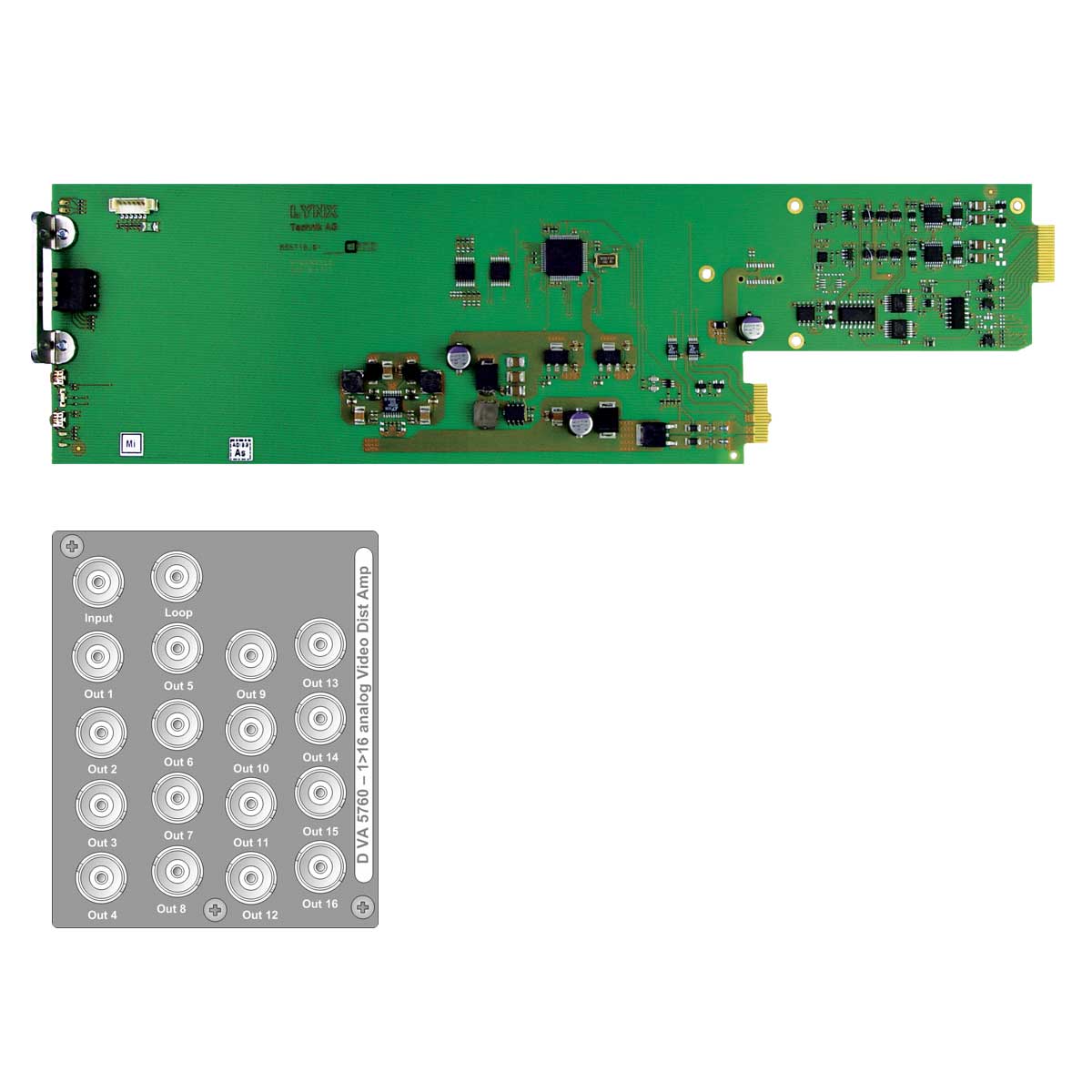 The D VA 5760 L is a flexible and cost-effective solution for high quality SD and HD analog video or sync distribution. The module has one input with passive loop through and 16 outputs. This module is ideally suited for demanding high quality broadcast and professional video applications.