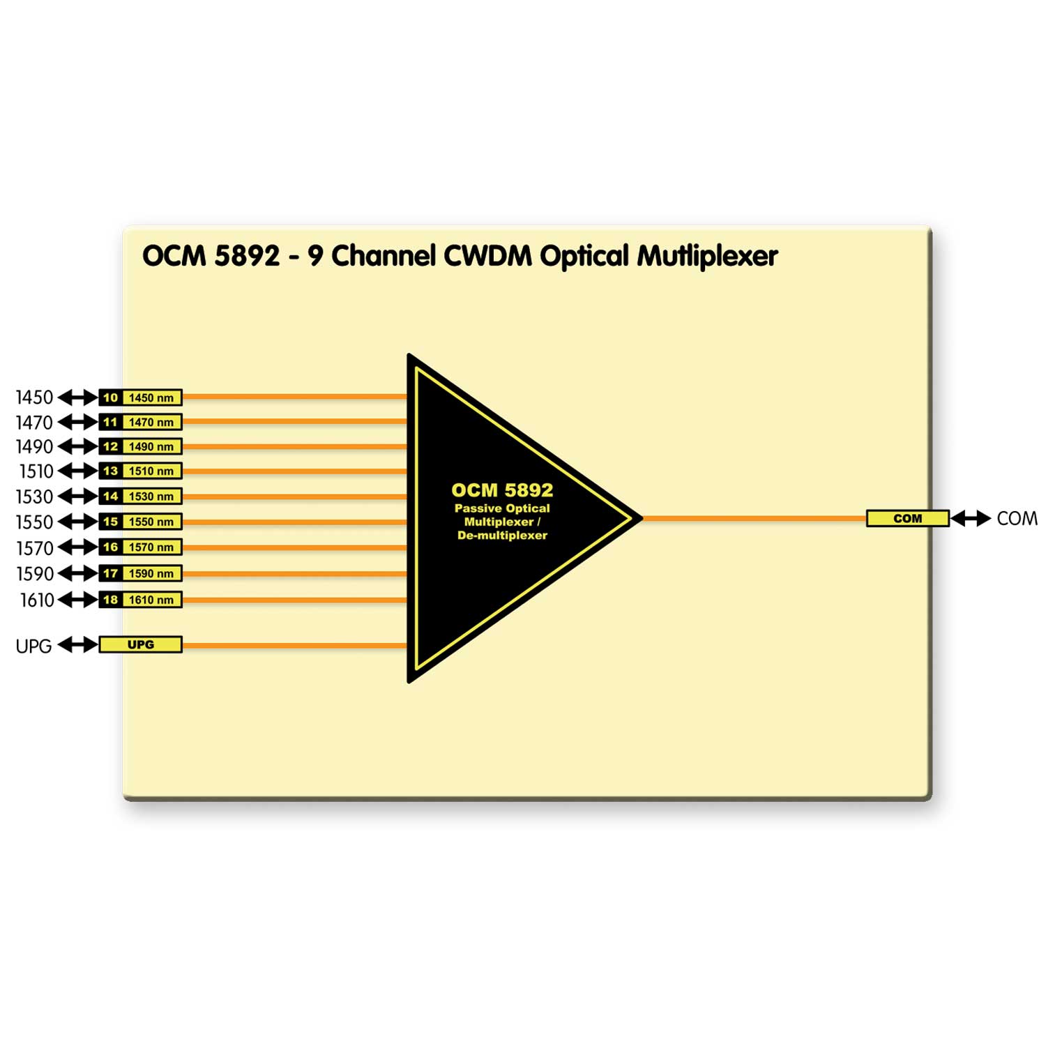 The module features a Upgrade Port (UPG) for expansion, when connected to the OCM 1892 the two modules (combined) will support all 18 CWDM wavelengths.