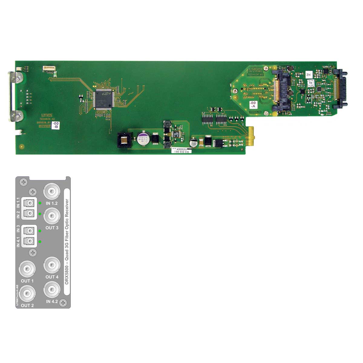 Up to 10 ORX 5800 (40 fiber Rx) can be placed in a standard 2RU Lynx rack frame. The fiber SFPs are secured to a connector board allowing for the main card to be removed or swapped without affecting the rear connections.