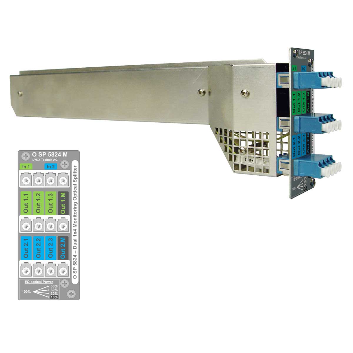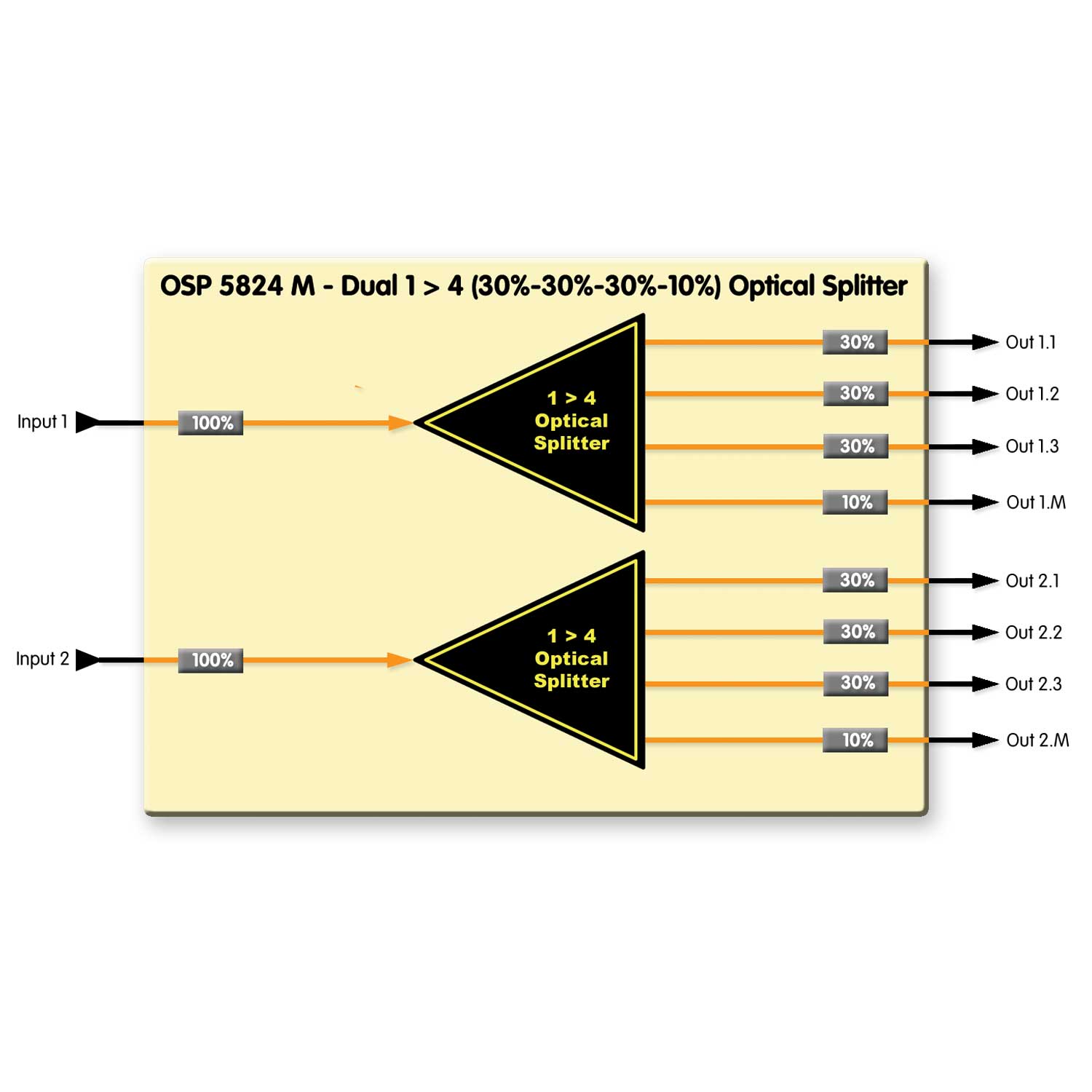 The OSP 5824 M provides 2 independent 1>4 optical splitter / combiners in a single module. For each channel the optical input is split into 4 outputs, three having 30% of the input power and one with 10% which is useful for monitoring applications.