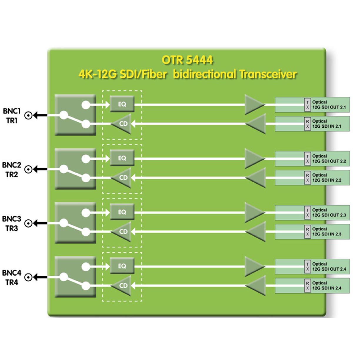 The OTR 5444 is a 4-Channel bi-directional 12G-SDI to Fiber suitable for video signals up to 4096x2160p 60Hz. It has four independent channels with automatic input clock rate and signal presence detection.