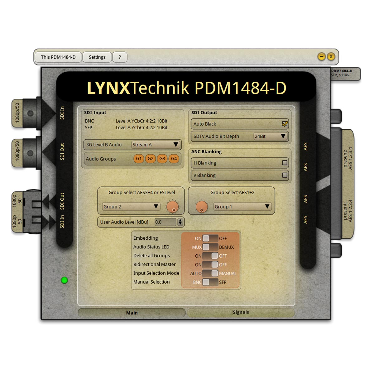 The “auto black” mode uses a black video frame if no SDI input is present. This allows the module to embed audio even when no video source is available. This mode is useful if the module is being used in an “audio only” application. The module is also compatible with the yelloGUI and LYNX Centraal software applications, which provides access to a host of additional internal settings which includes manual insertion of metadata (AFD,WSS,VI)