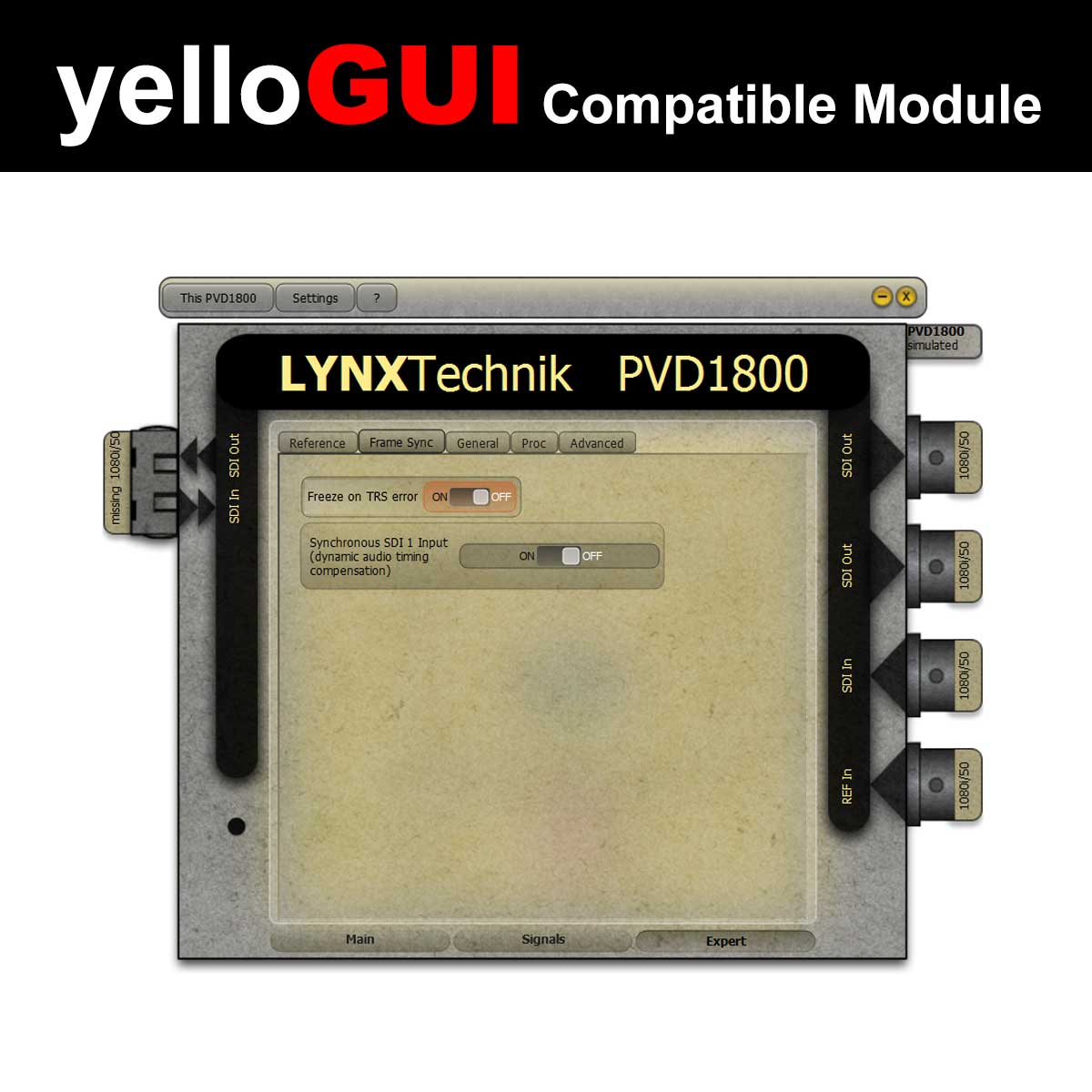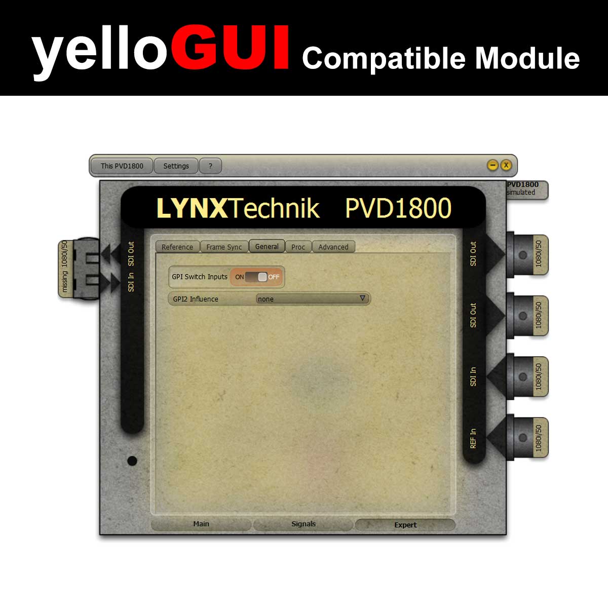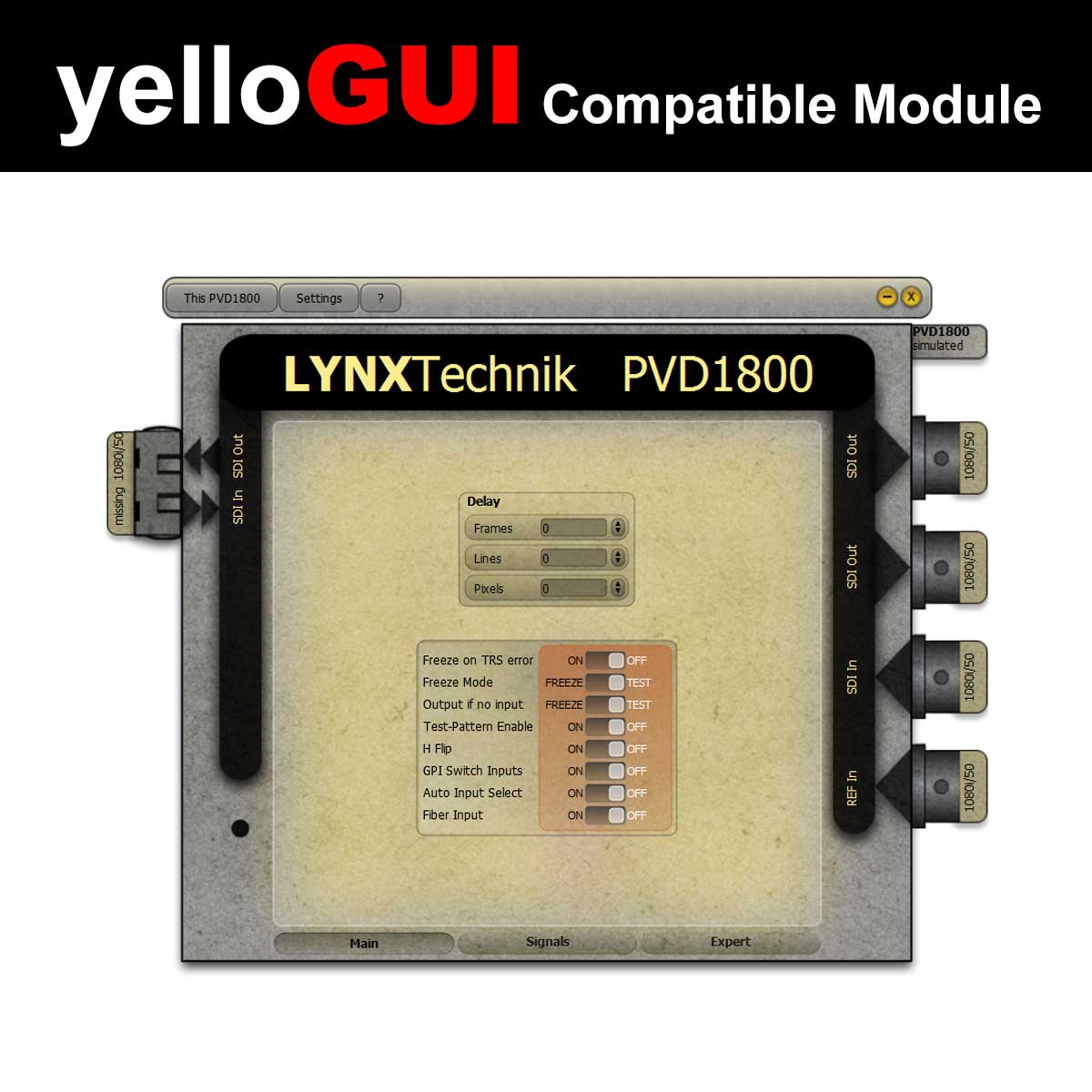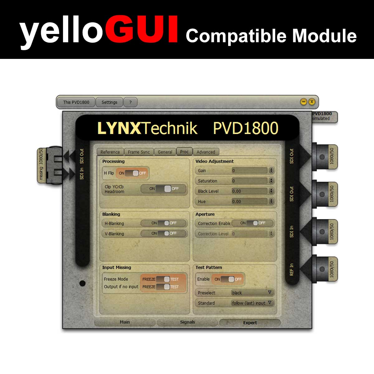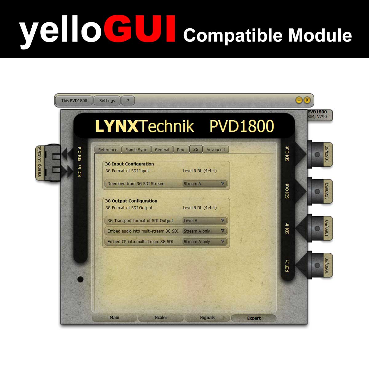 An integrated scaler can be used for high quality Up/Down/Cross conversion. When using the yelloGUI confrol software, it is also possible to select (extract) a region of interest from the incoming signal and display full frame on the output.